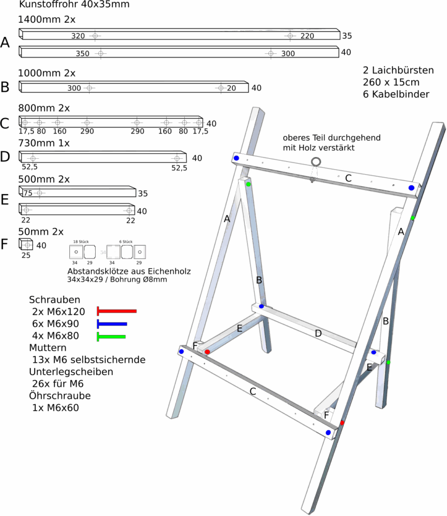 Es wurde ein neues Modell aus Aluminiumprofilen konstruiert und getestet. Dieses war schon deutlich besser, aber aufgrund des Materialpreises keine wirtschaftliche Lösung. Die aktuelle Version besteht aus 40 x 35 x 3 mm Kunststoffprofilen, zum Teil gefüllt mit 28 mm Baustahl zur Beschwerung und ist erfolgreich im Einsatz. Die befestigten Bürsten sind Laichbürsten aus der Koizucht mit 15 cm Durchmesser und 260 cm Länge.